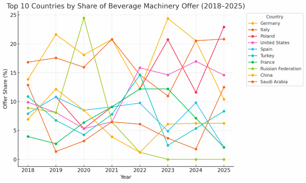 En el lado de la oferta, Europa mantiene un dominio claro. Alemania lidera con un 18,2 % de las máquinas llenadoras usadas disponibles, seguida por Italia (16,4 %) y Polonia (12,1 %). La reputación de fiabilidad y durabilidad de la maquinaria europea explica este liderazgo.