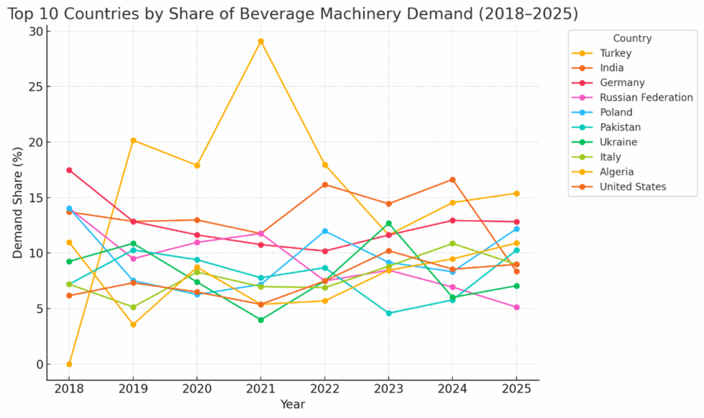 El análisis global de 2018 a 2025 sitúa a Turquía como el principal demandante de llenadoras usadas, con un 14,2 % del total de solicitudes. Este liderazgo se explica por los picos de actividad registrados en 2019 y 2021. Aunque la demanda turca disminuyó a partir de 2022, ningún otro país ha alcanzado su volumen acumulado.