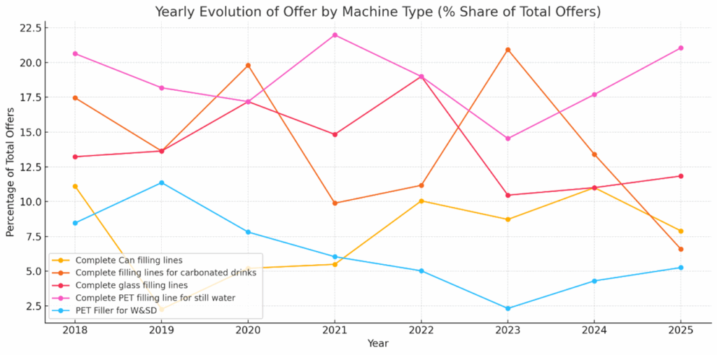 Durante el periodo 2018–2025, la mayor parte de la demanda de llenadoras de bebidas usadas se ha centrado en líneas completas de embotellado. Las más solicitadas son las líneas de PET para agua sin gas, que representan el 24,5 % del total de peticiones.